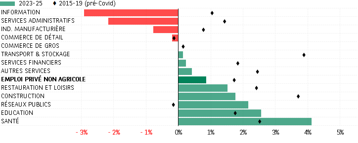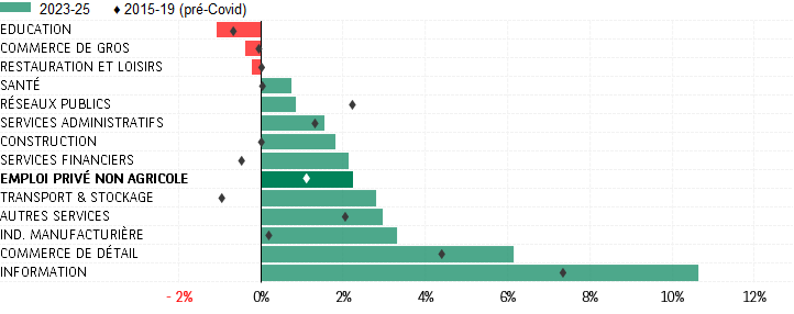 [3] Moyenne du 1er trimestre 2023 au 3e trimestre 2025. Source : US Bureau of Labor Statistics, US Bureau of Economic Analysis; les chiffres sont ceux de la productivité par tête.