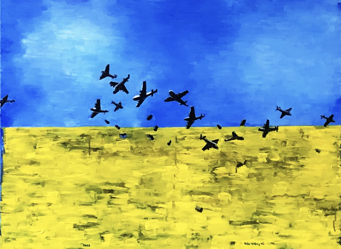 Né en 1964 à Hanoï, Tran Trong Vu vit à Paris depuis 1990 où il travaille. L’artiste pluridisciplinaire porte toujours un regard sur son pays d’origine mais pas seulement. Dans ses toiles et installations satiriques, il fusionne l’Histoire avec sa vie intime. Ses œuvres sont aussi parfois empreintes de références à l’histoire de l’art, à l’image de sa version du Champ de blé aux corbeaux de Vincent Van Gogh dans laquelle des bombardiers remplacent les corbeaux, et le champ de blé et le ciel, de par leur association de couleurs, forment le drapeau ukrainien.