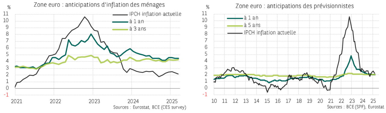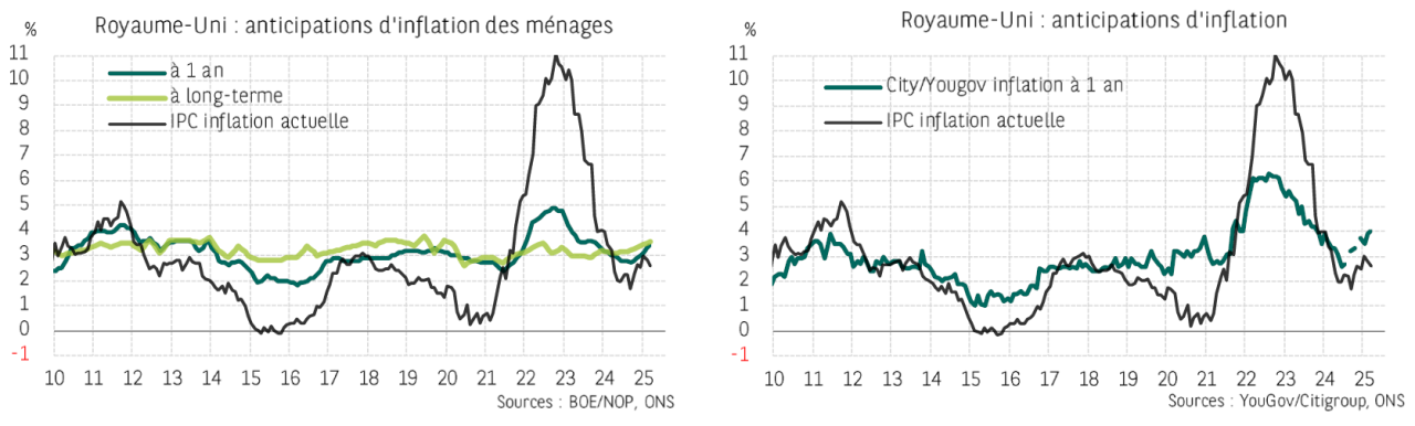 D’après nos prévisions, l’inflation américaine commencerait à visiblement remonter de façon visible à partir du T3 2025, dépassant légèrement 3% a/a, et atteindrait un pic à 4% au T2 2026. En moyenne annuelle, l’inflation s’élèverait à 3,1% en 2025 et 3,7% en 2026. Cette hausse ne procèderait pas d’une mécanique inflationniste auto-entretenue comme entre 2021 et 2023. De ce point de vue, elle devrait revêtir un caractère transitoire, à condition qu’une désescalade dans la guerre commerciale ait bien lieu, que la Fed ne baisse pas ses taux de manière prématurée et/ou que l’indépendance de cette dernière ne soit pas remise en cause. Le tout permettrait aux anticipations d’inflation des ménages de redescendre des sommets actuels et leur éviterait de devenir auto-réalisatrices.