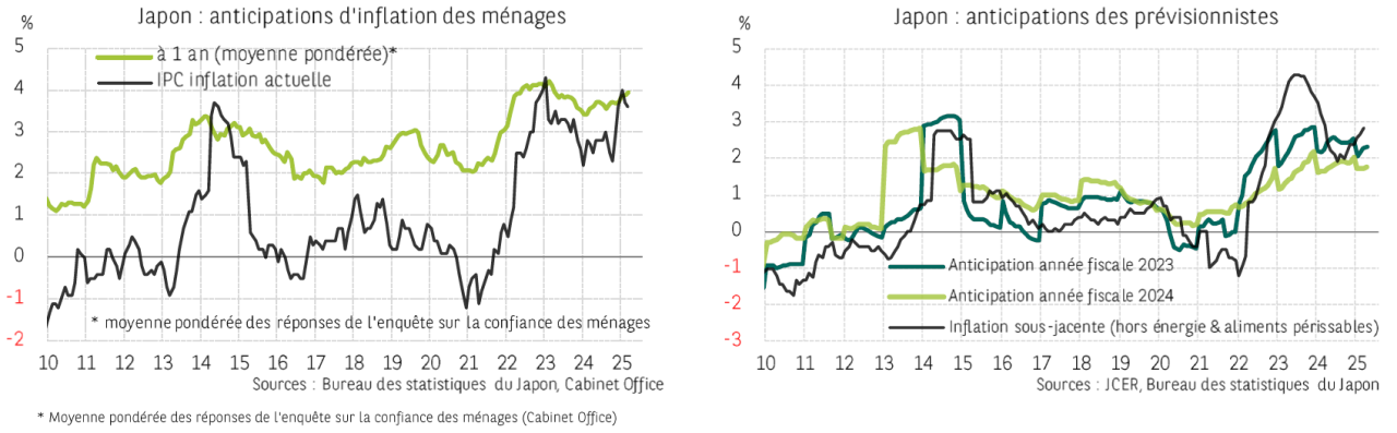 L’inflation a ralenti des deux côtés de l’Atlantique en mars, principalement en raison de la baisse des prix de l’énergie. Celle-ci a été favorisée par le recul des prix du gaz et du pétrole au premier trimestre 2025. Aux États-Unis, la situation reste néanmoins préoccupante avec des anticipations d’inflation des ménages à leur plus haut niveau depuis plus de 30 ans (enquête de l’Université du Michigan) ; elles augmentent également au Royaume-Uni sur fond de progression toujours robuste des salaires. La situation est nettement plus confortable en zone euro où les anticipations d’inflation restent modérées et les salaires décélèrent, ce qui conforte l’objectif des 2%. Au Japon, la situation reste sous contrôle.