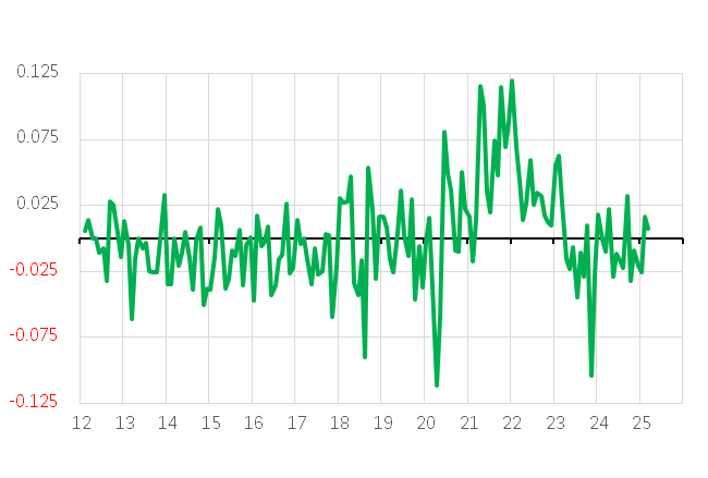 Afin de détecter et de surveiller au plus près ces traces, nous avons identifié les composantes de l’indice des prix à la consommation (IPC) américain correspondant au mieux aux 16 produits les plus importés de Chine[1]. Ces composantes représentent un peu plus de 10% de l’IPC sous-jacent. Notre graphique du mois montre leur contribution à l’inflation sous-jacente mensuelle depuis 2012 (date à partir de laquelle l’ensemble des données sont disponibles), ce qui permet d’avoir un peu de recul historique. La volatilité est assez importante : si cela n’a rien d’anormal, compte tenu de la fréquence mensuelle des données, cela rend difficile de distinguer le signal du bruit. La contribution moyenne comme médiane[2] est nulle sur toute la période. Le choc inflationniste de 2021-2022 est toutefois bien visible. On peut imaginer que le choc tarifaire sur les importations chinoises le sera aussi dans les prochains mois.
