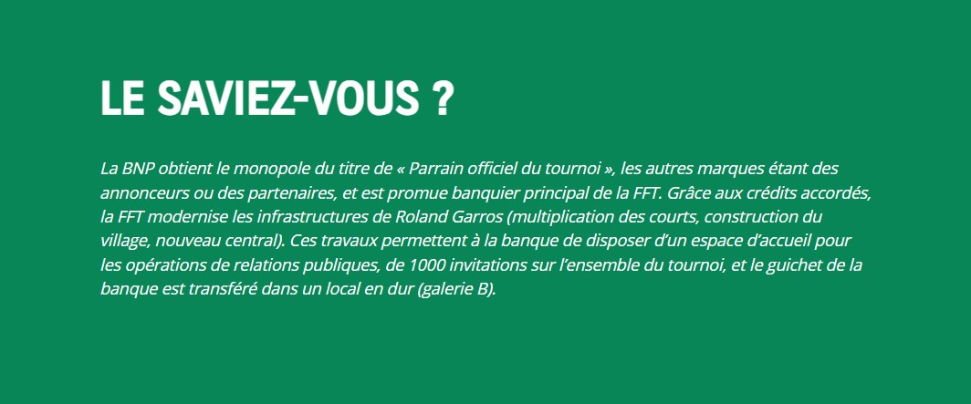 Le partenariat est plébiscité par tous les pays, toutes les activités et tous les métiers de BNP Paribas. Il est devenu un véritable levier de conquête et un accélérateur de notoriété, offrant une visibilité planétaire, tout en véhiculant des valeurs en phase avec la banque. C’est pourquoi, lors de la fusion de BNP et Paribas, c’est sur les bâches du tournoi de Roland Garros que le nouveau logo de BNP Paribas a été révélé.