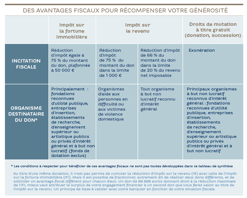 Il existe mille et une façons de faire preuve de générosité au service de l’intérêt général. La plus simple consiste à effectuer des dons à une association ou à une fondation œuvrant au profit d’une cause vous tenant à cœur. De tels actes sont encouragés par l’État par le biais d’avantages fiscaux (voir tableau à la fin de l’article). « Nous pouvons aider nos clients à identifier les organisations sans but lucratif, au niveau national et international, qui répondent à leurs aspirations philanthropiques et auxquelles ils pourront contribuer financièrement en toute confiance », commente Nathalie Sauvanet, responsable du conseil en philanthropique individuelle de BNP Paribas Banque Privée.