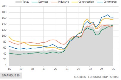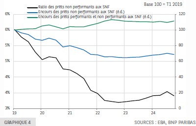 L’analyse des portefeuilles de crédits bancaires permet néanmoins de relativiser l’incidence des défaillances sur l’économie, y compris sur l’accès au crédit des entreprises. L’encours des prêts non performants aux sociétés non financières (qui concernent les SNF en difficulté ou celles susceptibles de l’être, mais pas nécessairement défaillantes) a enregistré une augmentation modérée depuis son dernier point bas à EUR 173 mds au T1 2023 (EUR 184 mds au T4 2024 pour notre échantillon de pays).