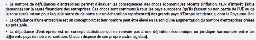 [1] Cet indice correspond à une moyenne pondérée par le PIB des défaillances de sept pays (Allemagne, Belgique, France, Italie, Pays-Bas, Royaume-Uni, Suède). L’Espagne n’est pas incluse dans cette moyenne car le périmètre des défaillances a été modifié en 2022. Un commentaire spécifique est intégré à la partie Espagne.