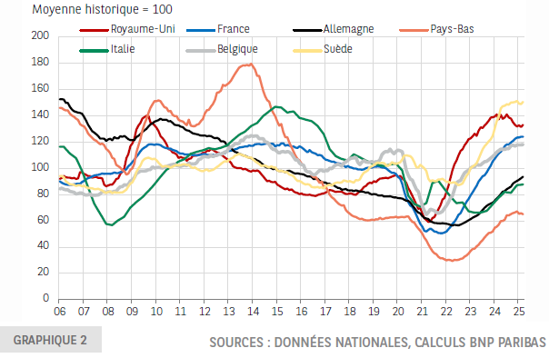 - Une deuxième phase de stabilisation dans un nombre croissant de pays (i.e. Suède, Belgique), voire de légère baisse au Royaume-Uni ou aux Pays-Bas. Toutefois, ces améliorations apparaissent nettement plus modérées que celles observées après d’autres pics (après la crise de 2008 ou celle de la zone euro), ce qui suggère davantage une érosion