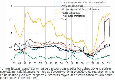 En mai 2025, l’encours des crédits bancaires aux entreprises nouvellement défaillantes ne constituait que 0,52% de l’encours total des crédits aux entreprises (en difficulté ou non). Le poids des très petites entreprises (TPE) défaillantes a toutefois dépassé très sensiblement sa moyenne historique. Corrigé de l’effet de la défaillance d’une seule TPE (dont l’encours des crédits était très important au regard de son effectif), qui a fait bondir entre avril 2024 et mars 2025 le poids économique de l’ensemble des entreprises défaillantes, ce dernier semble s’approcher d’un plateau.
