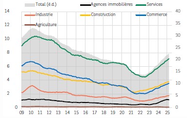 Les défaillances dans le secteur des services continuent de battre des records, notamment dans les services aux entreprises et l’hôtellerie-restauration (avec des difficultés de trésorerie pour ce dernier secteur). Cela est probablement lié à un effet « démographique ». Les nouvelles entreprises dans les services représentent aujourd’hui 69% des créations (contre 59% en 2015). Une dynamique qui ne se tarit pas (+3,7% a/a en mai 2025).