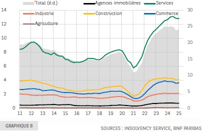 Les défaillances d’entreprises ont battu des records au Royaume-Uni en 2023 et 2024 (graphique 8) sous l’effet d’une accélération de l’inflation et d’un resserrement monétaire plus importants qu’en zone euro. Dans ce contexte, les retards de paiement ont augmenté de 1,3 jour pour atteindre le niveau élevé de 15,6 jours au T2 2022 selon Altares.