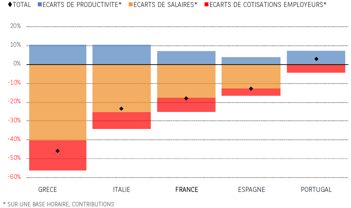 La sévérité de la cure grecque peut se mesurer au frein mis sur les salaires horaires et les charges attenantes, dont le recul atteint 18% en termes réels depuis 2012. Si aucun pays d’Europe n’est allé aussi loin en termes de modération salariale, beaucoup ont redressé leur compétitivité de manière similaire, l’Allemagne conservant ou augmentant son avantage en termes de productivité. C’est donc essentiellement par la maîtrise des coûts du travail que l’Italie, l’Espagne, dans une moindre mesure le Portugal, ont enregistré des progrès.