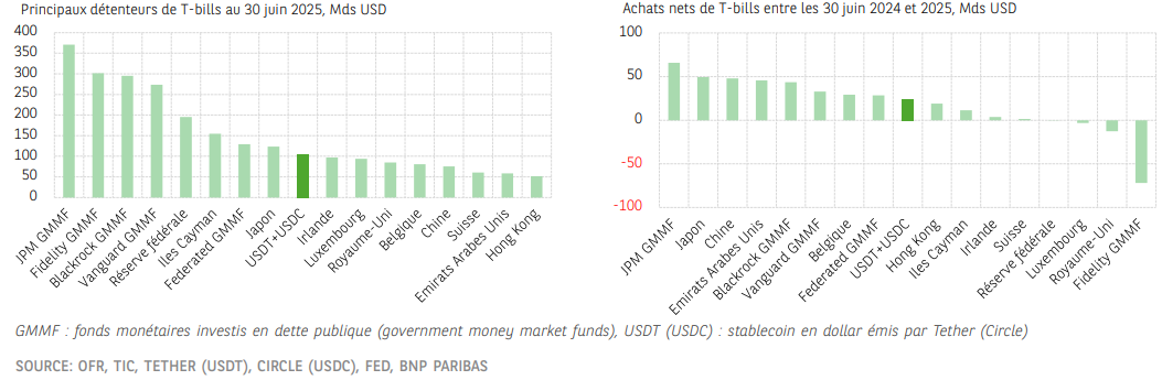 S. Bessent estime que ce texte pourrait porter l’encours des stablecoins à USD 2 000 mds en 2028 (contre USD 250 mds actuellement) et stimuler la demande de T-Bills d’autant3. Un tel engouement hisserait les émetteurs de stablecoins à la première place des détenteurs (graphique de gauche) et acheteurs nets (graphique de droite) de T-Bills.