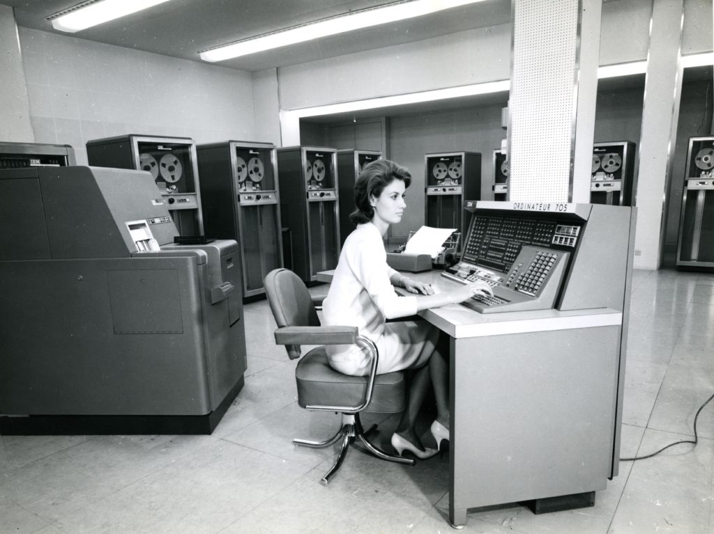 En 1957, le Comptoir national d’escompte de Paris (CNEP) commande le plus gros ordinateur de gestion développé en Europe, le Bull Gamma 60. Il est mis en service en 1961 après une période d’intégration. Dans la continuité de la mécanographie, les femmes contribuent au déploiement de cette nouvelle technologie.