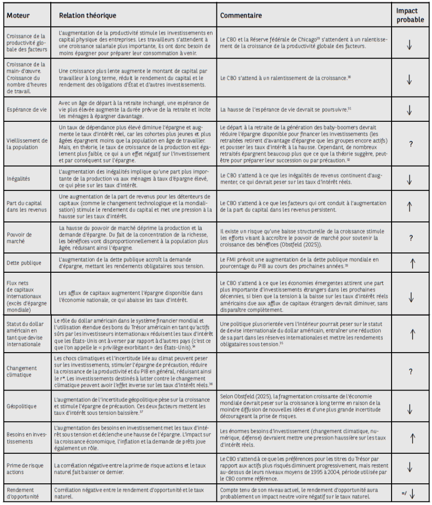 Tableau 1 – Les déterminants du taux naturel et leur impact futur probable sur les taux longs américains