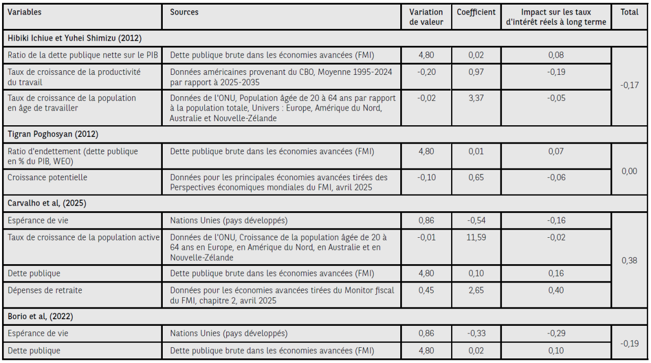 Plusieurs auteurs ont analysé la sensibilité des taux d’intérêt réels à différentes variables économiques. Dans divers documents, les variables démographiques (croissance du nombre d’heures de main-d’œuvre, proportion de la population âgée de 40 à 64 ans, taux de croissance de la population en âge de travailler, espérance de vie[39]) et les finances publiques ont un impact significatif sur les taux longs. Pour d’autres facteurs, les résultats sont mitigés voire faibles. Très souvent, la relation théorique n’est pas confirmée par les données[40] ou les coefficients ont le mauvais signe. C’est le cas pour la croissance de la productivité[41].