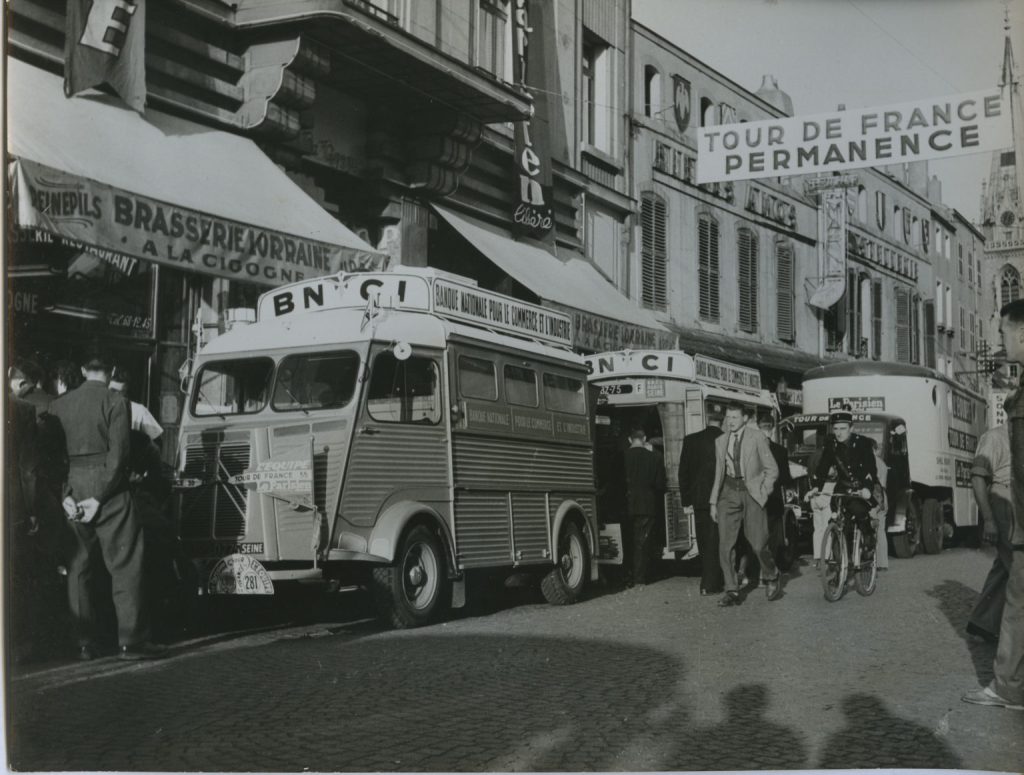 Grand succès sportif et populaire depuis sa première édition en 1903, le Tour de France prend une nouvelle dimension dans les années 1950. Départs depuis l’étranger, étapes dans le centre de la France, diffusion à la télévision… C’est ce moment que choisit la BNCI (Banque nationale pour le commerce et l’industrie) pour associer son image à la télévision, en 1955. Elle devient ainsi la première banque à parrainer le Tour.