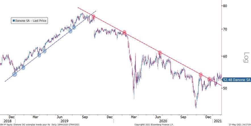 Une tendance boursière peut être haussière ou baissière (graphique de Danone ci-dessous). Elle se définit par un mouvement boursier clair et plus ou moins durable réalisé par un actif (un titre, un indice, une devise…).