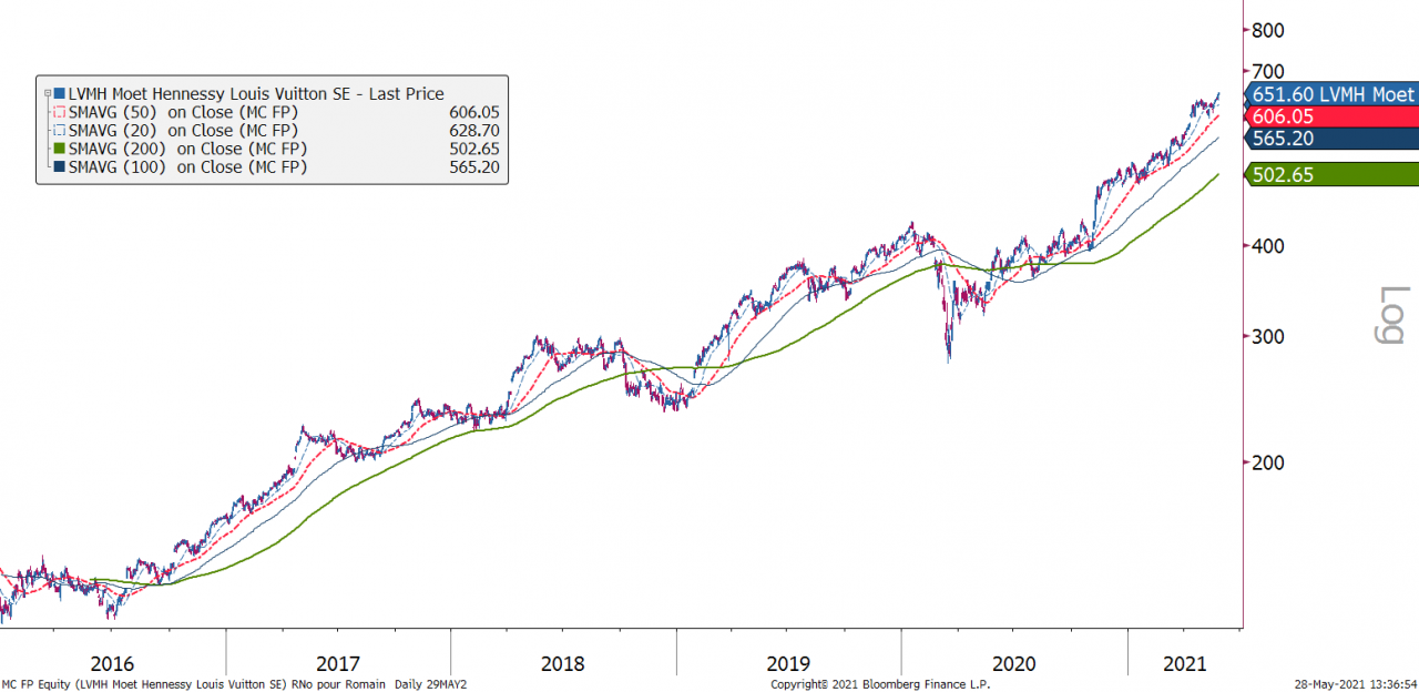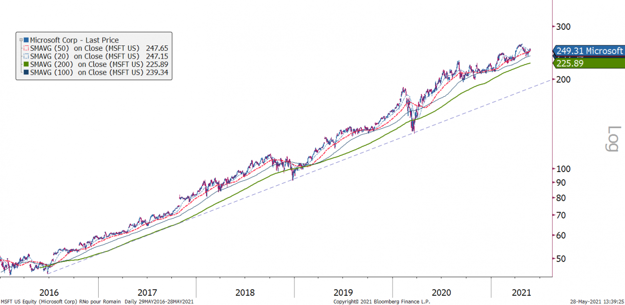 Voici trois exemples de valeurs qui sont en tendances haussières long terme et qui font régulièrement des plus hauts historiques : LVMH, Téléperformance et Microsoft.