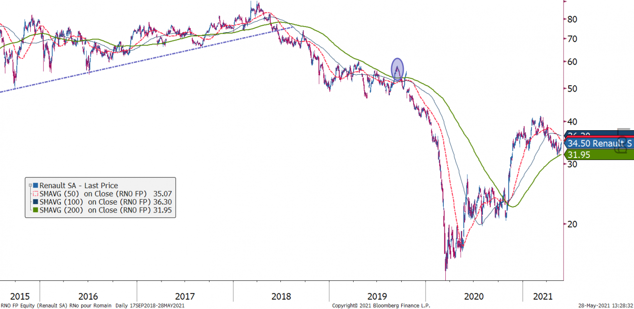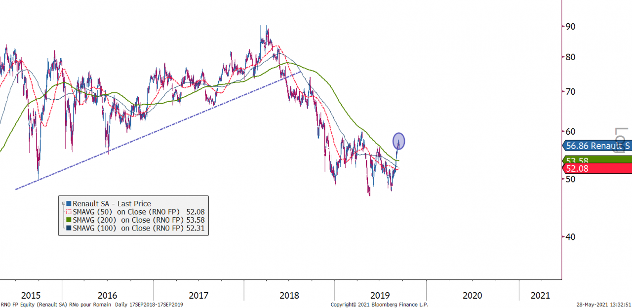 Pour illustrer ce dernier exemple, sur le graphique ci-dessous (Renault) nous voyons une valeur qui est en tendance baissière depuis quelques mois, et qui vient de perdre 30% sur un an (de septembre 2018 à septembre 2019).