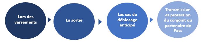 - Cinq cas de déblocage pour « accident de la vie » : le décès du conjoint ou du partenaire de Pacs ; l’invalidité du titulaire, de ses enfants, de son conjoint ou partenaire de Pacs ; le surendettement du titulaire ; l’expiration des droits à l’assurance-chômage du titulaire ; et la cessation d’activité non salariée à la suite d’une liquidation judiciaire ou à une procédure de conciliation.