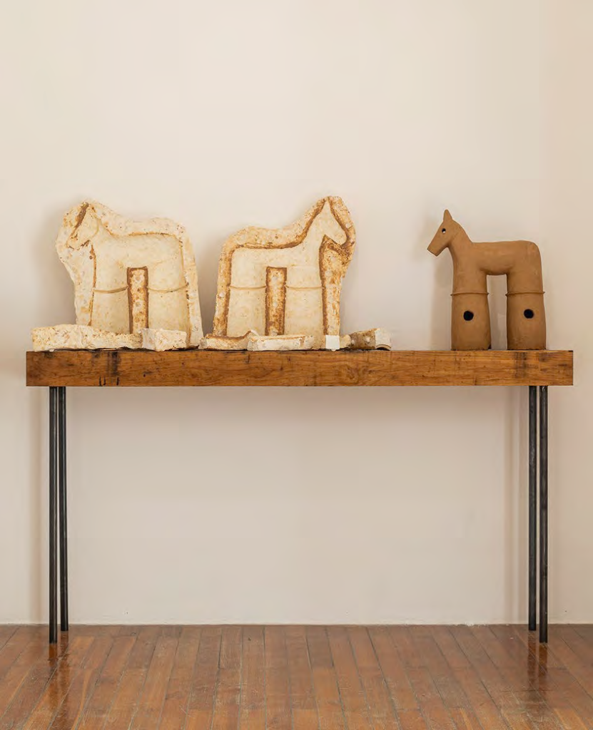 Les petites figurines de terre cuite dites haniwa de la période kofun, découvertes au Japon, aussi bien que le badigeon sommaire d’une toile avec des couleurs terreuses, suggérant parfois des figures, font partie de ces gestes et de ces images que l’artiste prélève et transporte, qu’il « récolte » comme il le dit lui-même, les reprenant à son compte pour les faire participer à de possibles nouvelles récoltes, édifiant l’une après l’autre une société à la fois parallèle, quelque peu secrète, et ambitieuse.