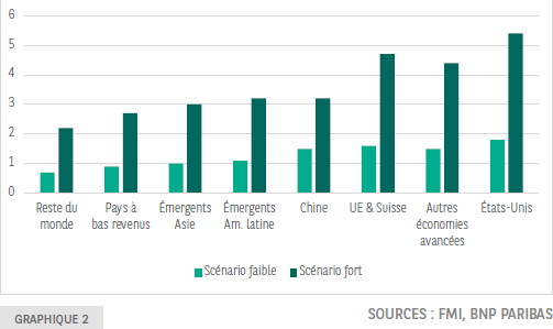 Les simulations du FMI réalisées par Cerutti et al. (2025) illustrent deux trajectoires contrastées : un scénario d’adoption et de diffusion rapide et un autre plus lent. Dans le premier scénario, la PGF mondiale progresserait de 2,4% en dix ans, entraînant une hausse du PIB global de 4 % par rapport à la trajectoire sans IA. Dans le second, la progression de la PGF et celle du PIB seraient limitées à l’horizon de 10 ans à seulement, respectivement, 1,8% et environ 1,3%, en raison d’une adoption partielle.