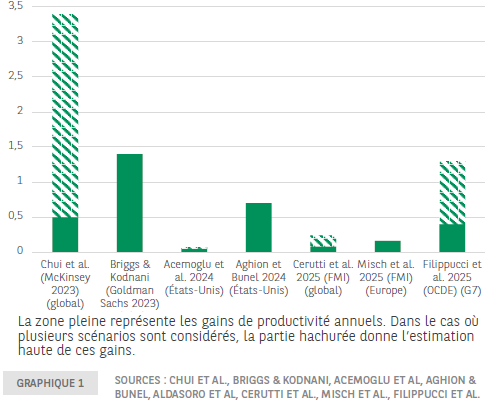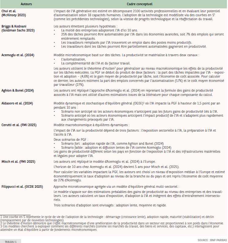 De nombreux travaux récents modélisent l’IA comme un choc technologique positif affectant la productivité globale des facteurs (PGF) (tableau 1 et graphique 1).