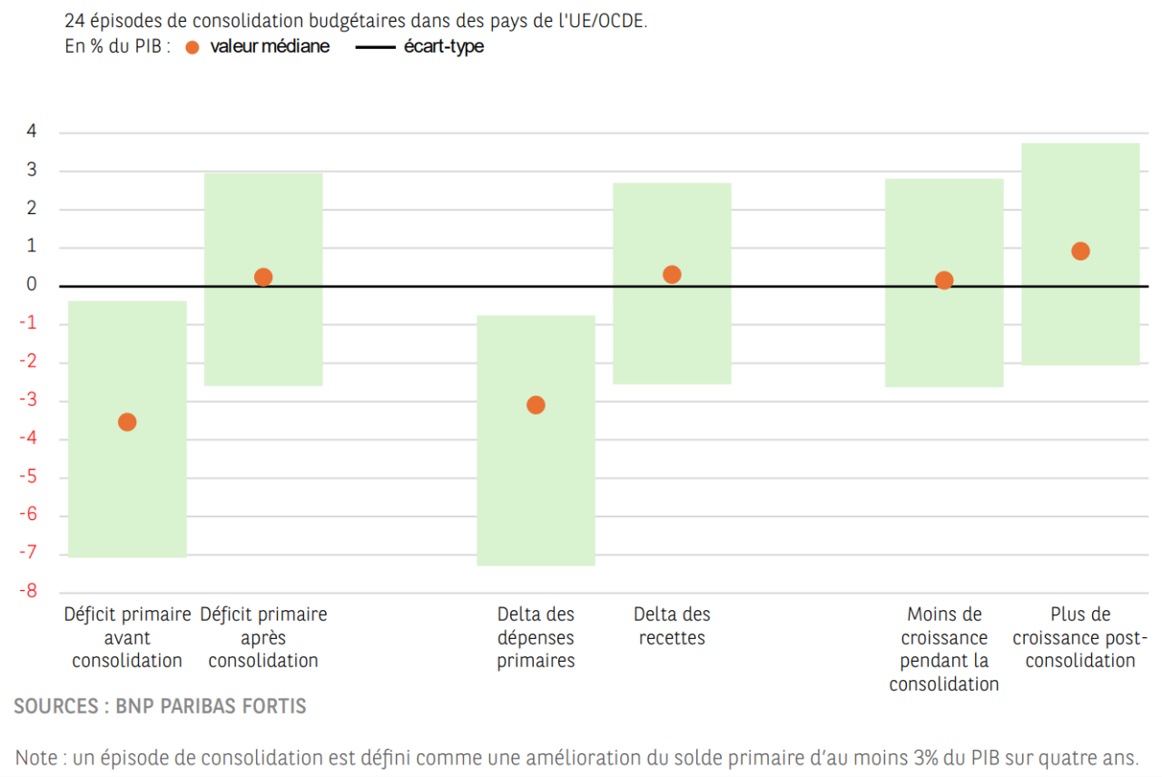 Le vieillissement de la population, la hausse des taux d'intérêt à long terme et celle des dépenses de défense pèsent sur les finances publiques de tous les pays de l'OCDE. L'assainissement budgétaire – qui peut se mesurer par une amélioration du solde primaire d'au moins 3 % du PIB en quatre ans – est essentiel pour nombre d'États. Mais cela semble plus facile à dire qu'à faire. Que nous apprennent vingt ans de finances publiques européennes ? Historiquement, pour les pays de l'UE, un assainissement axé sur les dépenses semble être une approche efficace qui tend à favoriser la croissance ensuite.