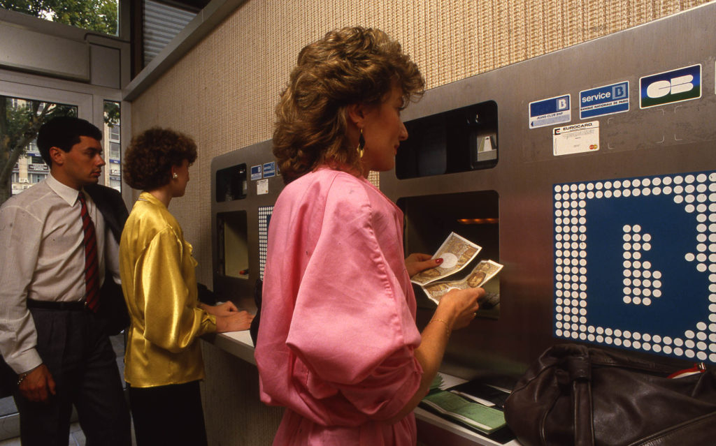 A cette époque, débutent aussi les premières expériences de paiement électronique. Introduite dans le terminal du commerçant, la carte à piste magnétique permet d’interroger en temps réel les ordinateurs de la banque sur l’autorisation de dépense accordée à l’acheteur.