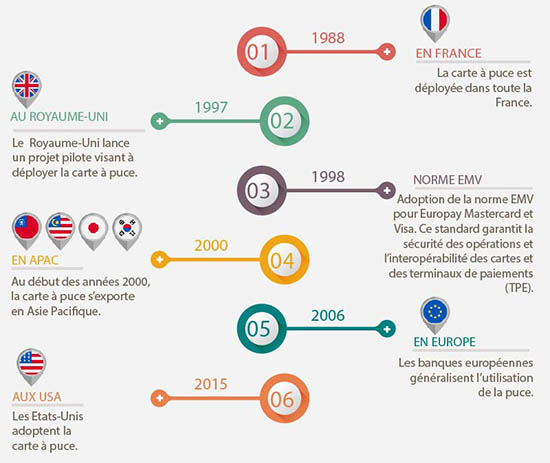 En 1993, toutes les cartes bancaires émises en France sont équipées d’une puce. Le destin international de la carte à puce prendra un peu plus de temps à se réaliser. La plupart des pays sont restés fidèles à la piste magnétique car le coût de la fraude se révélait inférieur à ceux induits par l’adoption de la carte à mémoire. C’est à l’horizon 2006 que les banques européennes généralisent l’utilisation de la carte à puce.
