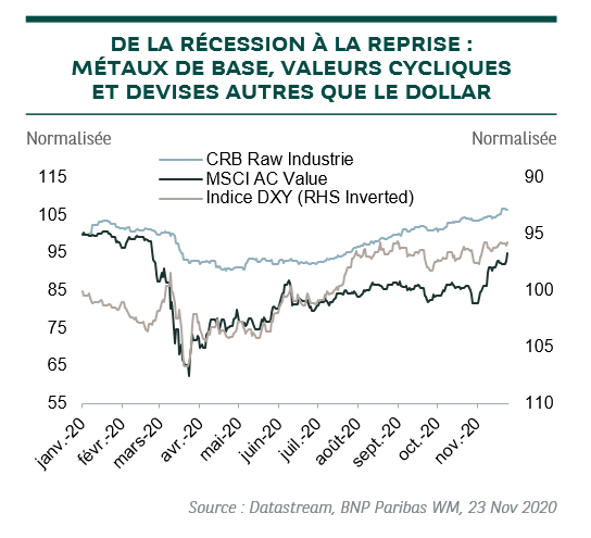 Au début de la reprise économique, vont se combiner la hausse progressive des rendements obligataires, l'affaiblissement du dollar, la hausse des marchés actions et la reprise des secteurs économiques cycliques.